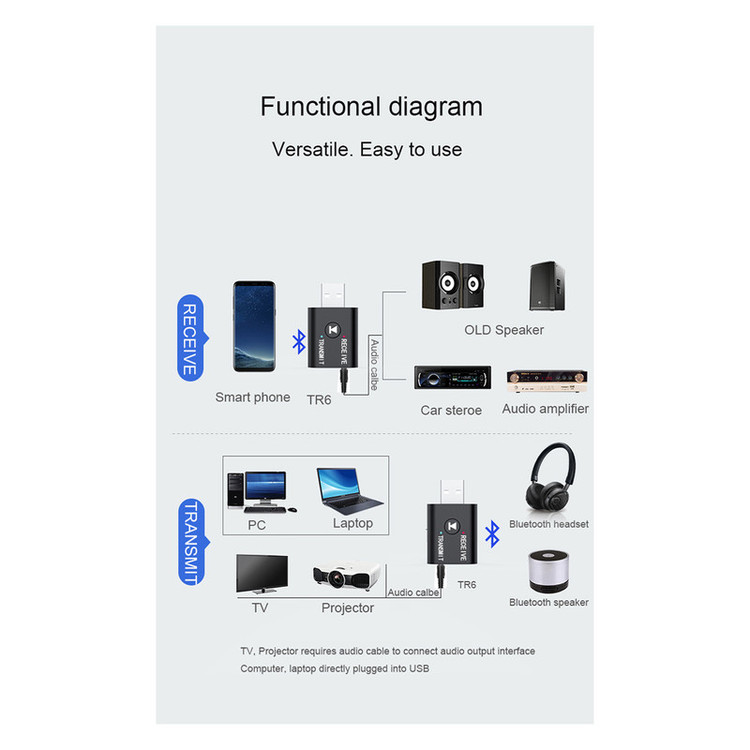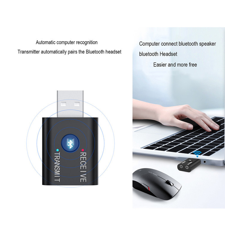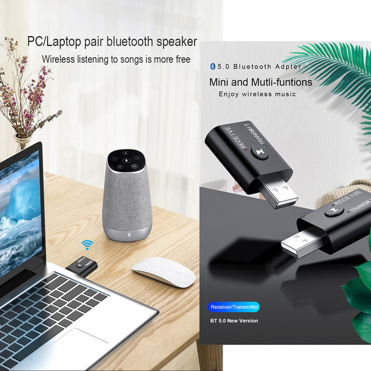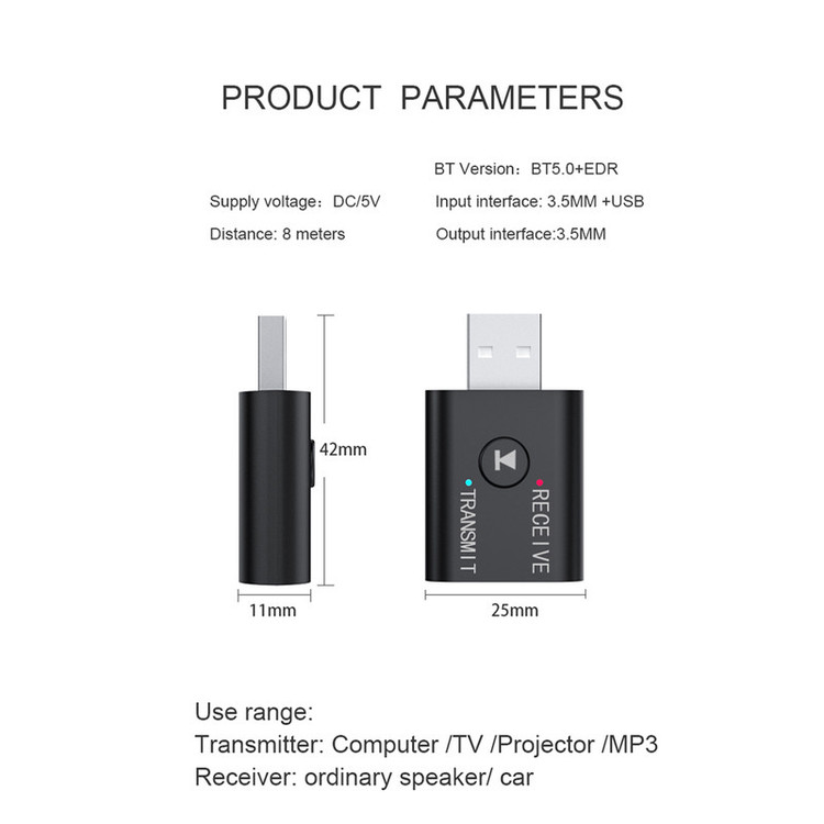 USB Bluetooth Receiver and transmitter Material:ABS Bluetooth:V5.0 Output:AUX Input:bt wireless/ AUX type:Bluetooth Wireless Adapter Function:USB BT Audio Transmitter BT ReceiveR size:4.2x2.5x1.1cm