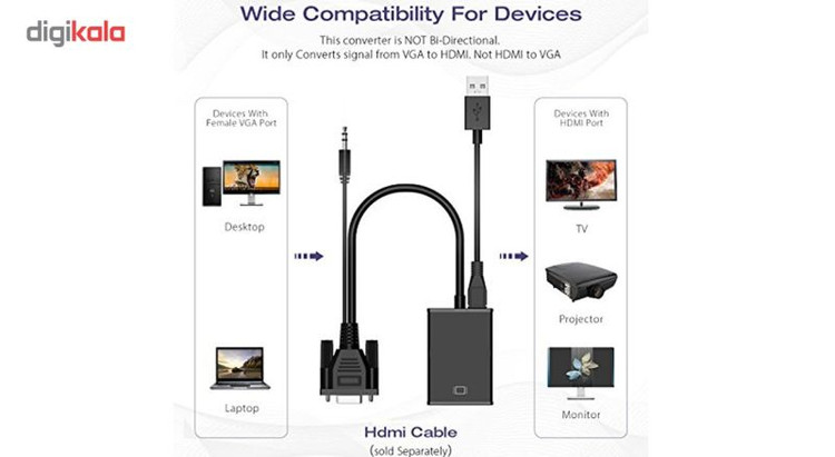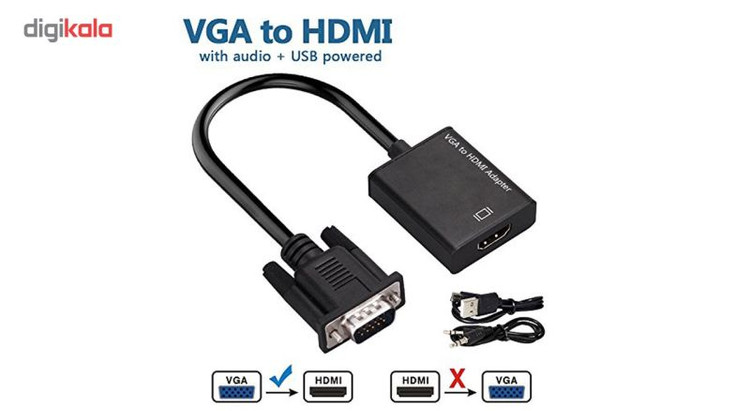 مبدل VGA به HDMI مناسب انتقال تصویر از دستگاههای دارای VGA مانند کامپیوتر و نوت بوک و... به دستگاههای دارای ورودی HDMI با قابلیت انتقال صدا و دارای کابل پاور جهت تامین برق دستگاه.